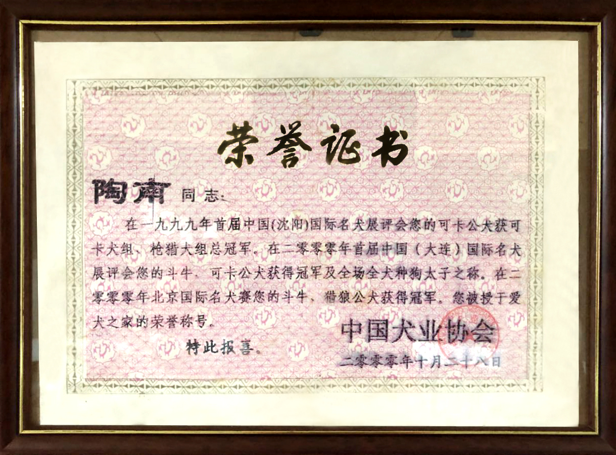 2000年大連國(guó)際名犬展英國(guó)斗牛犬,美國(guó)可卡犬獲得BIG家庭犬組冠軍級(jí)“全場(chǎng)狗太子”未成年犬全場(chǎng)總冠軍榮譽(yù)稱號(hào)。